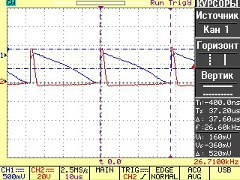 U_R, пропорциональное току через катушкуI_кат. - Канал 2: Напряжение на обмотке W1.