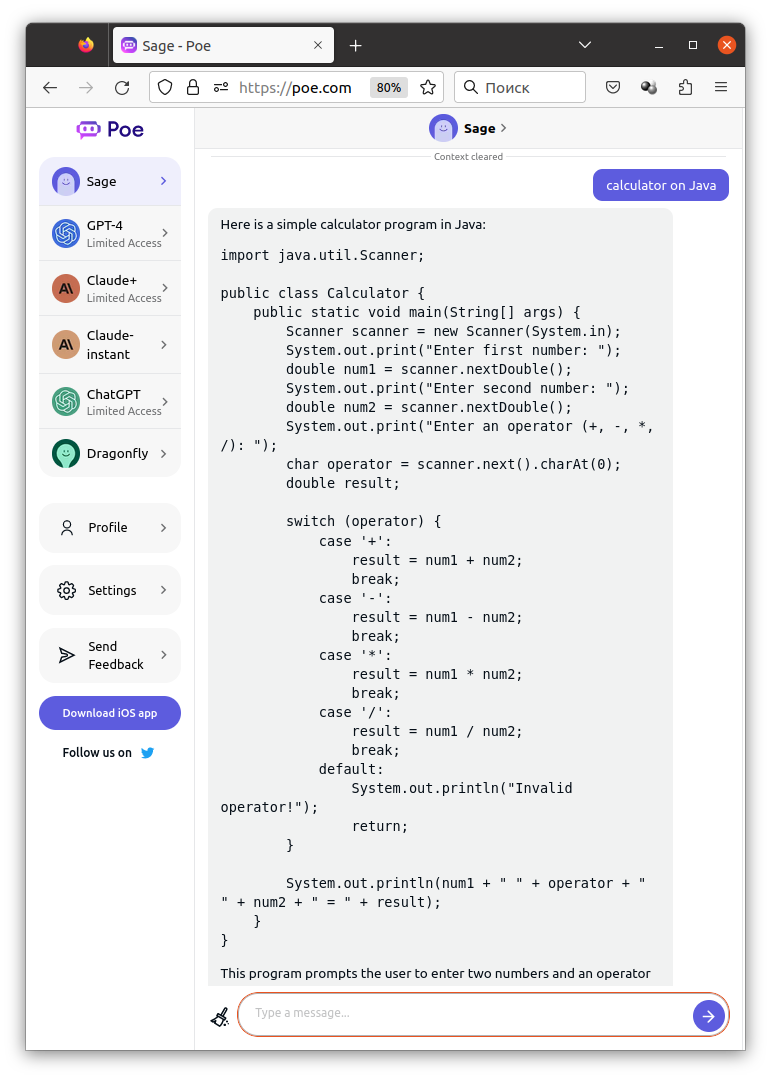 Просим чат Sage ИИ написать калькулятор